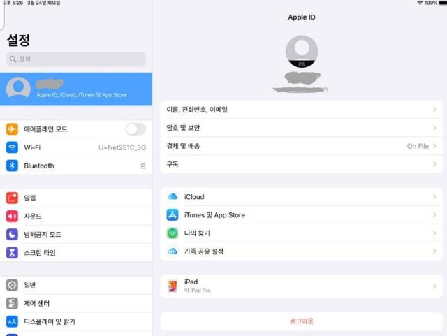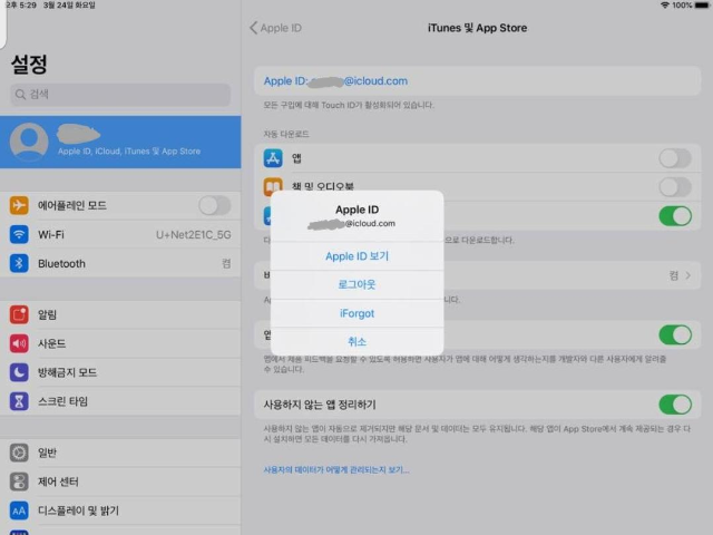 젤 위에 있는 파란색 아이디를 터치하면 팝업창이 뜨는데 애플 아이디 보기에 들어감.