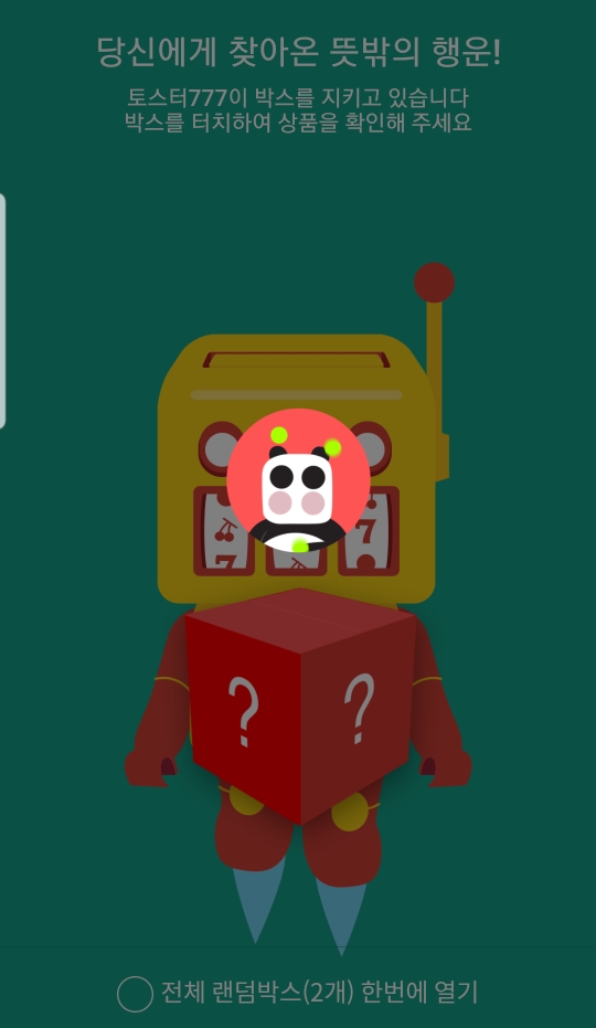 이렇게 충전한 1만원으로 2개의 랜덤박스를 구매완료했고 박스열기라는 상자 모양을 터치하면 몇초후에? 바로 상품확인이 가능하다.눌럿!!