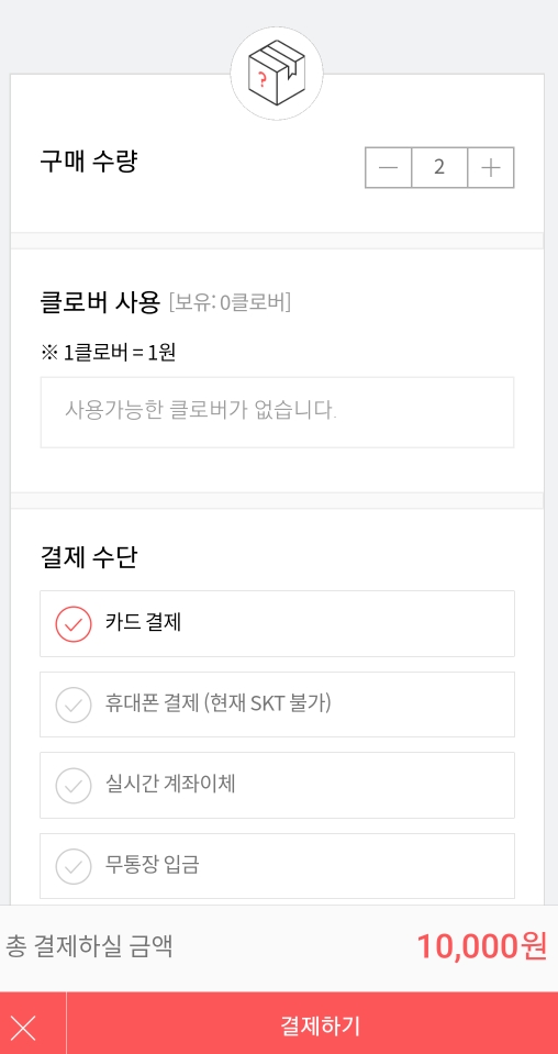 랜덤투유의 클로버는 보시다시피 1클로버당 1원이라 캐쉬같은 개념인거 같음. 아무튼 요즘 백수에겐 적지않은 1만원 결제...
