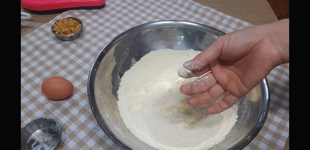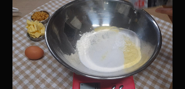 출처를 밝히고 싶은데 영상을 이것저것 너무 많이봐서 헷갈려서 어느분의 레시핀지 기억이..잘...ㅋㅋ 암튼 플레인이나 다른 스콘은 만들어 봤는데 옥수수가루가 들어간 스콘은 한번도 만들어 본적이 없어서 영상을 참고해서 따라 만들어 보았음.우선 미리 준비해둬야 할 재료는 깍둑손질해놓은 버터85g과 캔옥수수 55g과 계란하나.