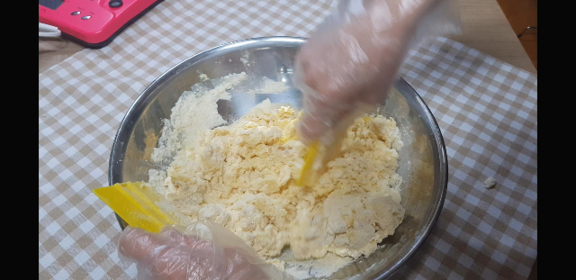 스크래퍼로 해시태그를 그리듯 세워서 슥슥슥 긁듯이 가루와 옥수수 알갱이와 액체류를 잘 섞이도록 슥슥 그어주다가 어느정도 한 덩어리처럼 뭉쳐질 기미가 보이면 손으로 빠르게 많이 치대지?말고 ㅋㅋ적당히 주물주물 해서 한 덩이로 만들어 준다.