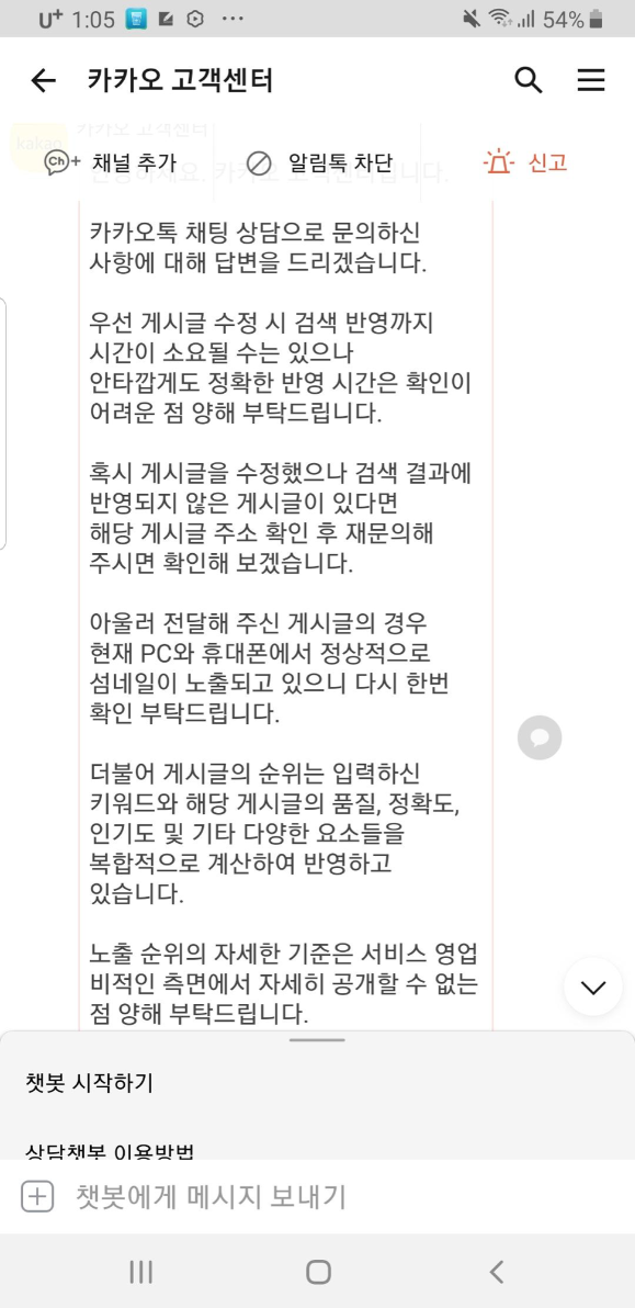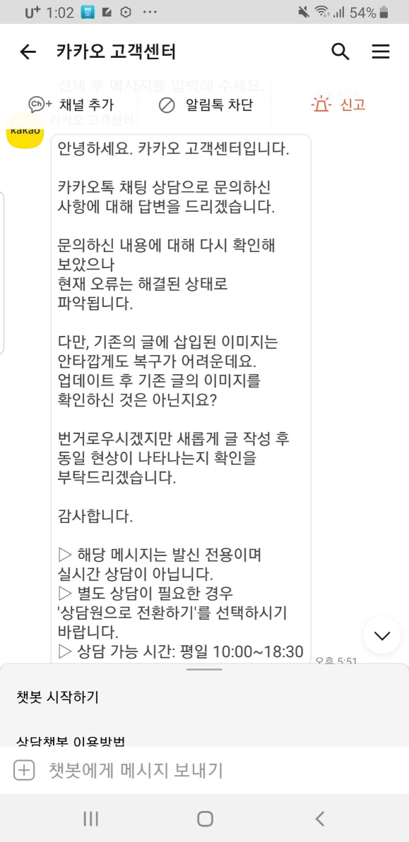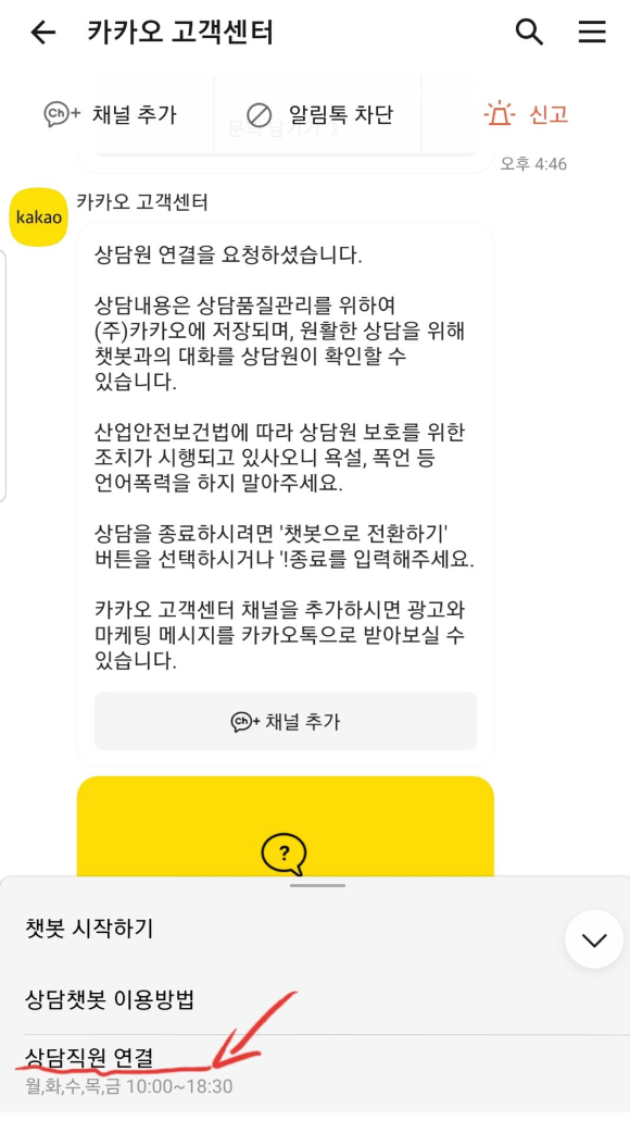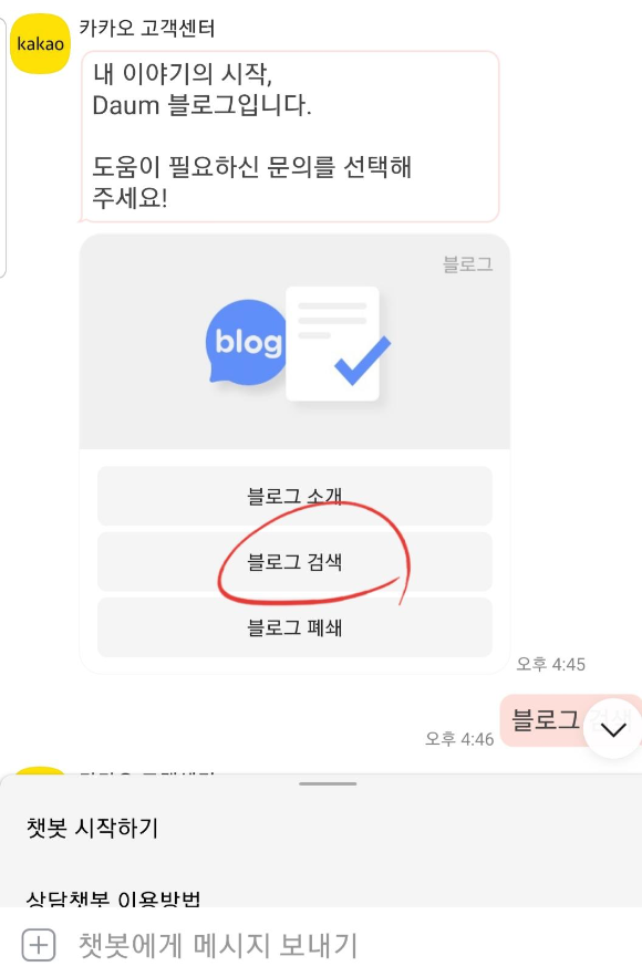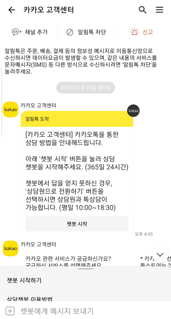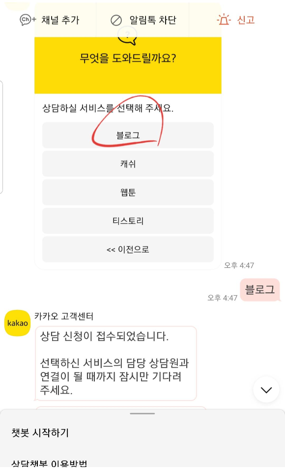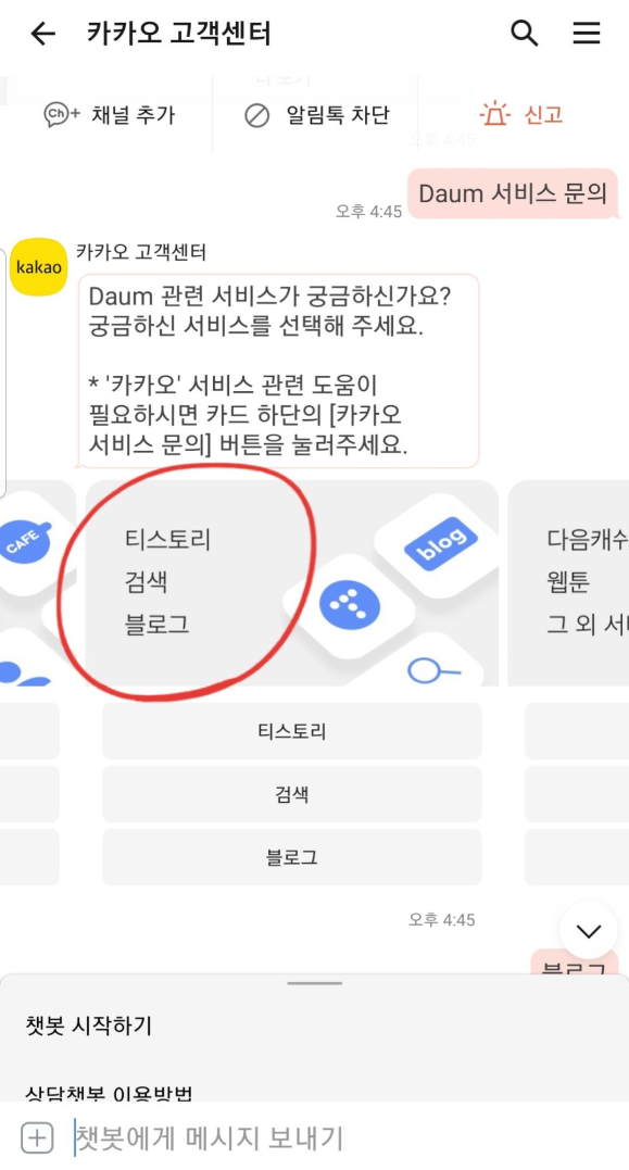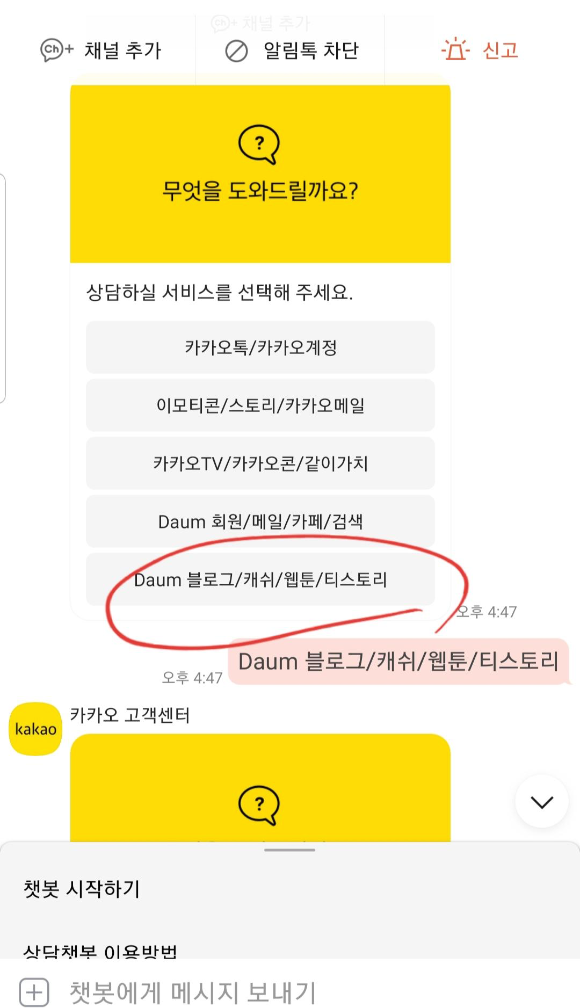 말이 길어졌는데 나도 처음 티스토리 블로그에 문제가 생겼을때 다음 고객센터에 문의하며 받은 편지함을 기다렸던 기억이 나는데 지금은 카카오 고객센터 채널을 즐겨찾기 해 놓고 수시로 궁금한건 물어보고 귀찮게 하고 있다. 카카오톡에서 카카오 고객센터 채널을 친구추가 하면 대화창이 바로 뜨는데 거기서 관련되는 항목을 체크해 준다. 약간 귀찮을때는...그냥 바로 하단에 있는