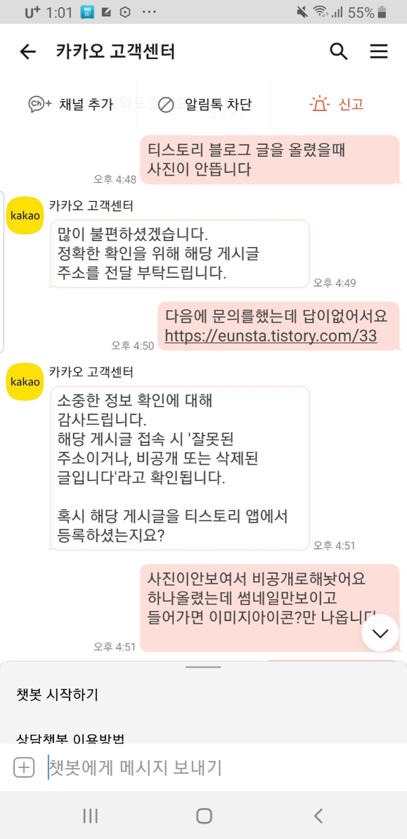 몇가지? 캡쳐본만 등록했지만 사실 진짜 사소한것도 자주자주 물어봤는데 다음 고객센터에 문의했을때 속이 답답해서 ㅋㅋ다음에 문의했는데 답이없다고 얘기함.ㅋㅋㅋ 이때는 티스토리 앱에 문제가 있었는지 무슨 말로 설명하기 힘든 상황이 발생했고 이것때문에 글을 2개나 올렸다가 지우고 난리도 아니었음... 상담원분이 봤을때는 문제가 없는데 내가 문제가 있다고 하니 앱을 다시 지우고 깔아보라고 해서 여차저차해서 상담원이 안내하는 대로 했더니 결국 해결이 되었다...