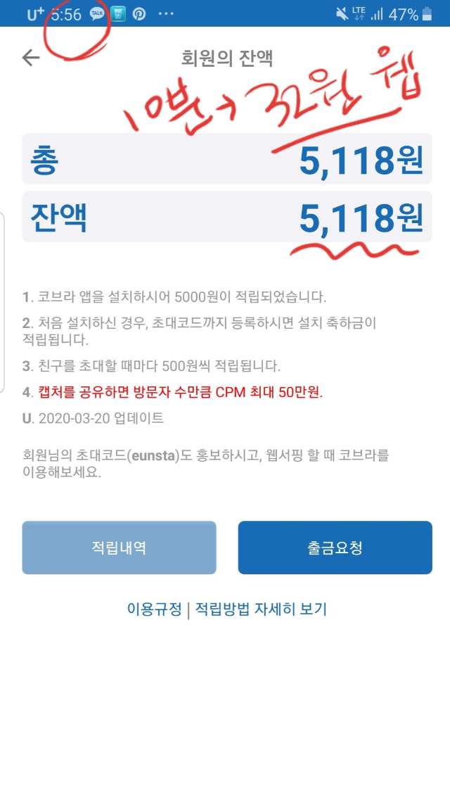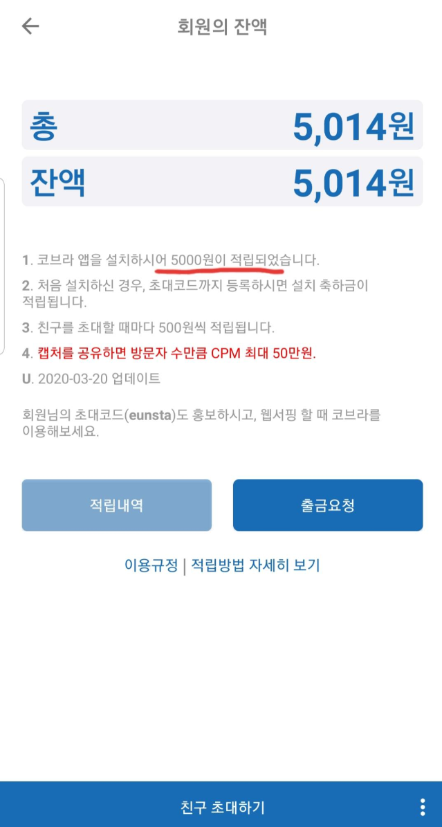 그리고 설치만 했을때 2000원이 적립, 추천인을 입력하면 5000원이 적립되서 나는 닥터구구님 껄로 추천했고 혹시나 추천할 아이디가 없으신 분은 eunsta로 추천해주시면 추천인에게 500원 가입인에게는 3000원이 추가로 적립됩니다 ^^