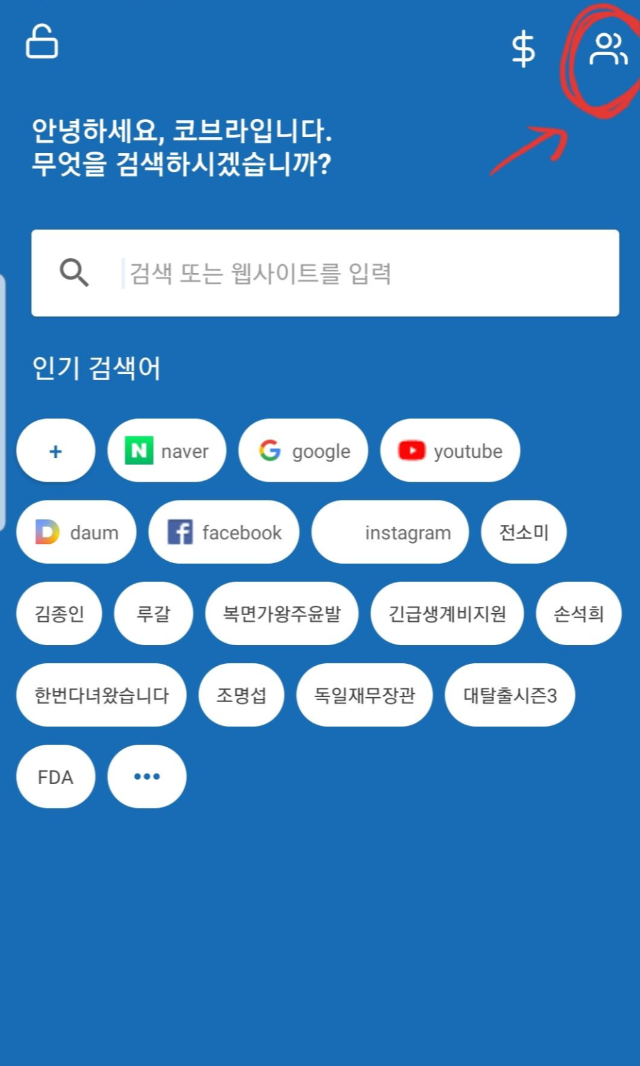 모바일만 가능하니 앱스토어에 가서 코브라브라우저를 설치한다.(안드로이드 아이폰 모두 가능하다고 함.) 가입방법도 엄청 간단한데 메인 페이지에서 오른쪽 상단에 있는 사람모양을 눌러서 프로필을 입력하고 시작해야 한다.