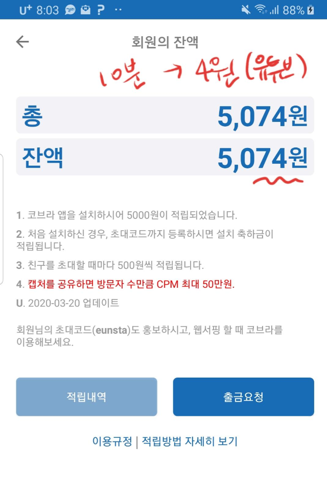 처음에 신기해서 시험삼아 코브라 브라우저로 들어가서 네이버 웹서핑을 잠깐 했는데 생각보다 빨리 쌓이길래 놀라서 몇가지 시도를 해봄.. 그리고 광고없이 웹서핑만 해도 되니까 세상편함... 바로 유튜브 시청과 웹서핑은 차이가 있을까? 였는데...ㅋㅋ