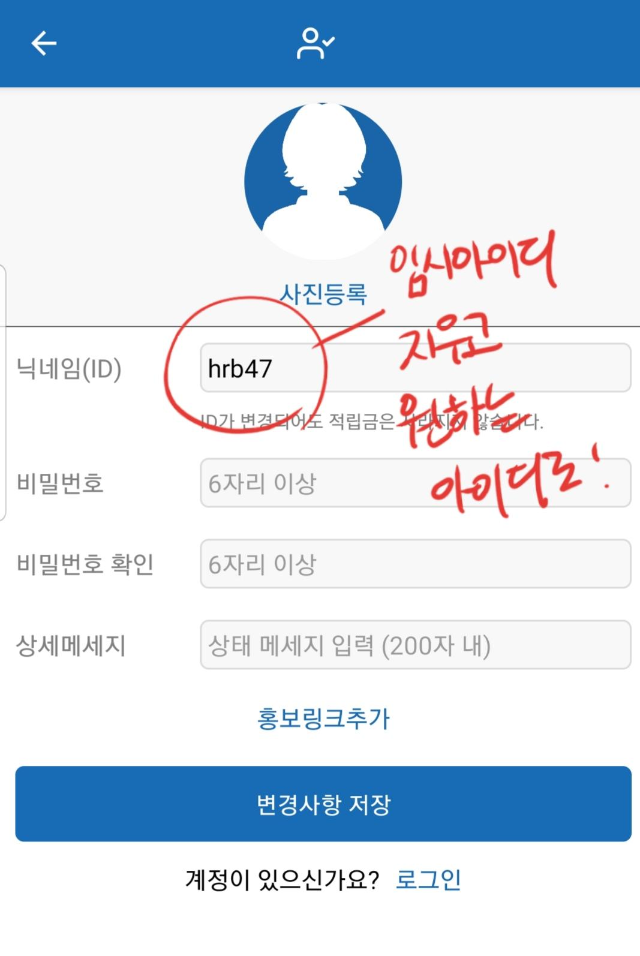 사람모양으로 들어가면 임시로 부여된 아이디가 있는데 무시하고 지운 다음 내가 원하는 아이디로 바꾸고 핸드폰번호와 출생년도 성별만 입력해주고 핸드폰으로 날아온 번호 인증만 해주면 된다. 나름 간편