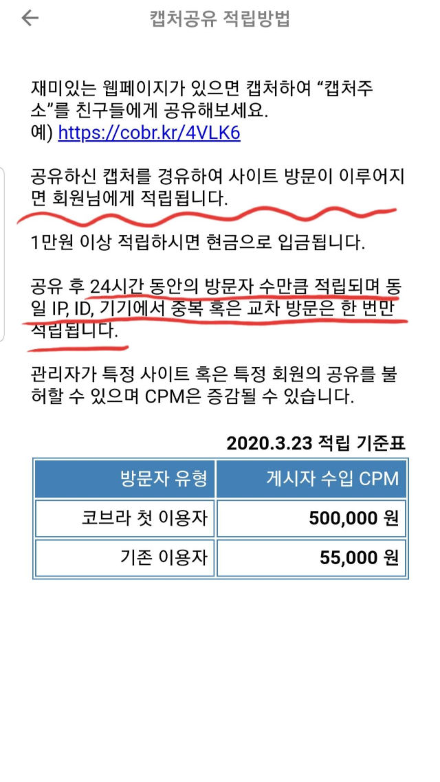 캡쳐공유의 링크를 내 블로그나 카페나 어디든 공유를 해서 24시간내에 어떤 방문자가 클릭을 하게되면 설명상에는 방문자 수 만큼 적립되고 중복은 안된다고 나와있는데 중복 안되는건 당연하지만 큰 단점은 링크를 클릭한다고 바로 적립이 되는게 아니라
