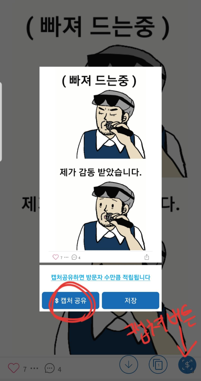 내가 보고있는 웹 페이지에서 공유하고 싶은 일부를 캡쳐를 한다. 오른쪽 하단에 달러모양을 터치하면 캡쳐가 되는데 캡쳐공유를 하게되면 링크가 생성되고 저장을하면 그냥 저장이 된다.