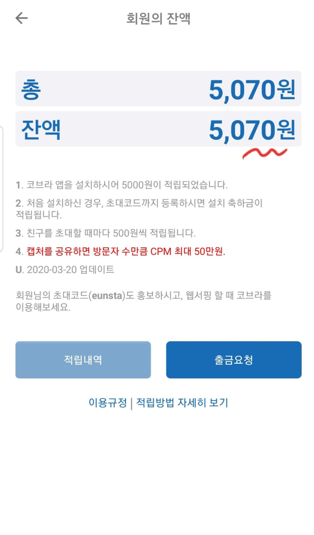 그래도 괜찮다고 생각되는 앱테크 들도 잠금화면 밀기를 해도 하루에 다소 한정적인 금액만 쌓이고 광고나 웹페이지를 봐야하고 나름 괜찮은 설문 앱도 하루에 100원적립이 최대더라고..ㅋㅋㅋ 근데 그냥 광고 안봐도 되고 내가 웹툰 웹검색할때 그냥 코브라 브라우저로 들어가서 하던대로 웹서핑 하기만 하면 되니까 진짜 괜찮은듯....ㅋㅋㅋ불편한게 없잖아!!ㅋ