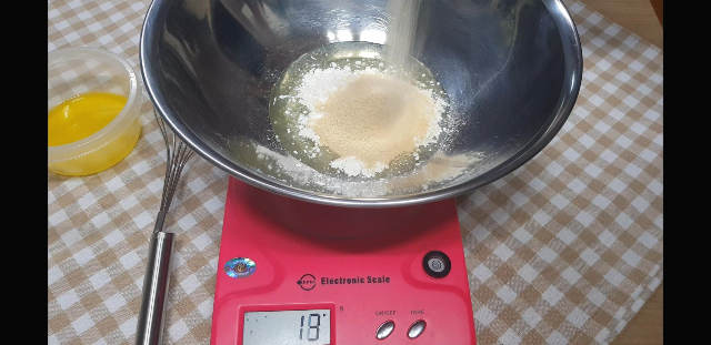 저울 0을 맞추고 밀가루30g(강력분 중력분 상관없음),설탕50g(백설탕 없어서 황설탕 사용),소금 세꼬집? 정도 넣고