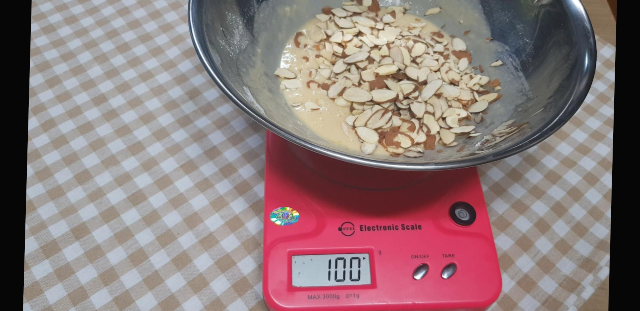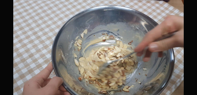 오늘의 주인공 아몬드 슬라이스 100g을 넣어주고 거품기를 내려놓고 숟가락으로 교체