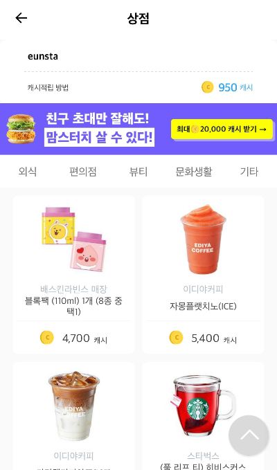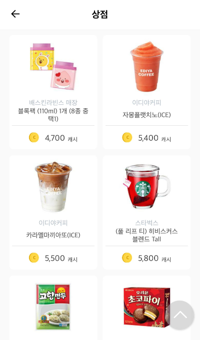 모은 캐시는 어떻게 사용하느냐 상점에 들어가면 각종 편의점 화장품 등등 제품을 캐시로 결제하고 기프티콘으로 받아서 사용하면된다. 현금출금은 안되는듯