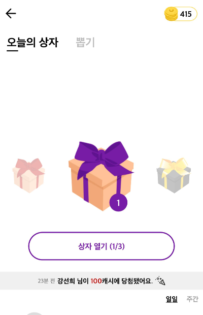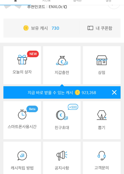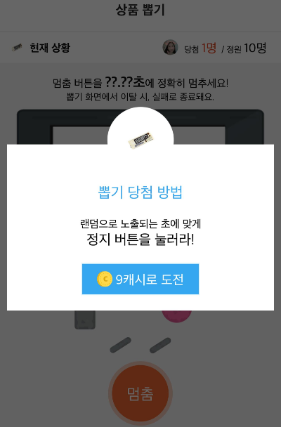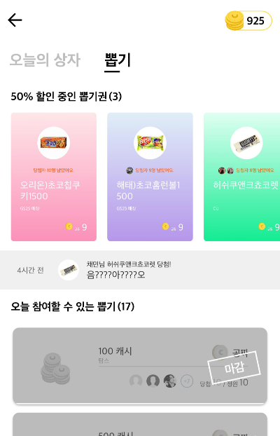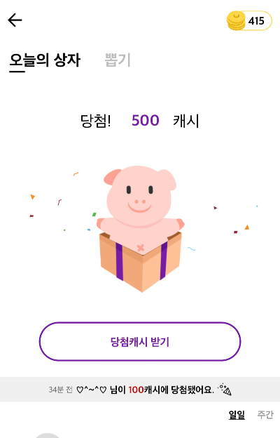 참고로 참여할 수 있는 뽑기에는 100캐시 500캐시를 도전 할 수 있는 기회도 있는데 내 생각엔 이거는 정원이 있어서 타이밍 못맞추면 거의 불가능 할듯.ㅋㅋㅋ