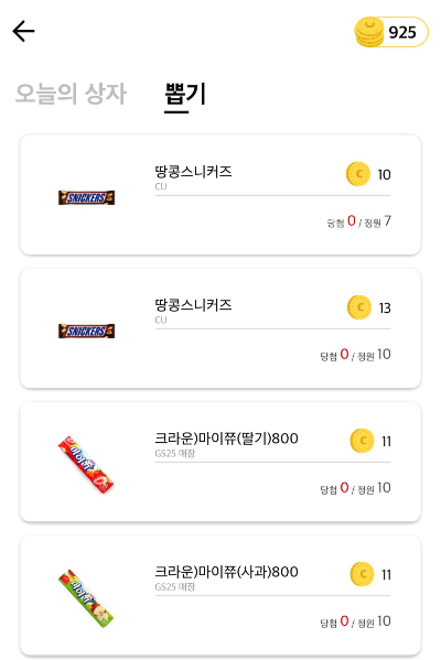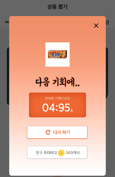 또 하나의 쏠쏠함은 오늘의 상자 옆 탭을 터치하면 뽑기가 나오는데 한번 도전하는데 9원 10원이면 가능하다. 뽑기 메뉴들은 일반 편의점이나 마트에서 볼 수 있는 1000원 전후의 제품들을 10원으로 도전해서 제시하는 초를 터치해서 맞춰주는 아주 단순하면서도 오기 생기는 게임. 이게 은근히 5초가 제시되면 4.95 , 4.99에서 자꾸 실패하게 된단 말이지 ㅋㅋㅋ
