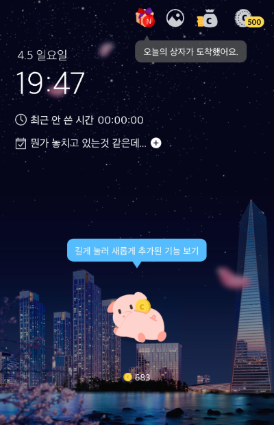 나름의 칭찬을 늘어놓아 보자면 날짜와 시간 아래에 적립한 시간 그러니까 핸드폰을 쓰지 않은 시간이 표시 되고 그 아래에 우선 뭔가 놓치고 있는것 같은데... 라는 한줄은 바로 오늘 내가 해야할 체크리스트를 입력 하면 잠금화면에 저렇게 표시가 된다는거. 그리고 일을 처리하면 다시 해제할 수 있는 좋은 기능인것 같다. 심지어 디자인도 예쁨..ㅋㅋ