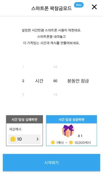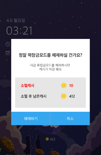 그래 그럼 니가 1시간 약속을 지키면 랜덤캐시 선물상자를 줄께!! 그대신 못 지키면 10캐시를 반납하는거다!!! 오케이 콜!! 이라면 시작하기 버튼을 누르면됨 ㅋㅋㅋㅋ 그리고 혹시나 그 사이에 못참고 핸드폰을 봐야된다. 해서 잠금해제를 시도하면 경고의 팝업이 뜬다.ㅋㅋㅋㅋ 그리고 약속을 지키게 되면 그 후에 상자확인을 할 수가 있는데