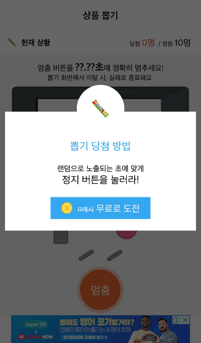 화면은 이렇습니다. 육개장을 10캐시로 도전 터치하면 제시하는 초가 있고 3초후에 시작되서 4초 타이밍을 정확하게 터치해주면 됨.ㅋㅋㅋ 참...쉽죠?