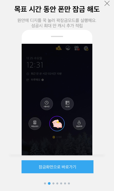 우선 기본적인 캐쉬적립 방법은 핸드폰을 쓰지 않으면 잠금화면에 귀여운 돼지 엉덩이 주변으로 15분을 체크하는 색이 채워지는데 15분을 사용하지 않고 방치해 두면 1원이 쌓인다. 그리고 방치하다가 다른 앱에 들어갔다가 다시 잠금을 해 두더라도 이전에 적립에 이어서 진행되서 좋긴 하지만 딱 요것만 들으면 크게 뭐..ㅋㅋ 별로 감흥이 없는데...?