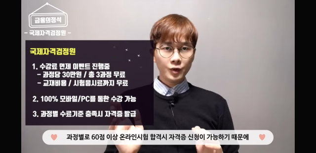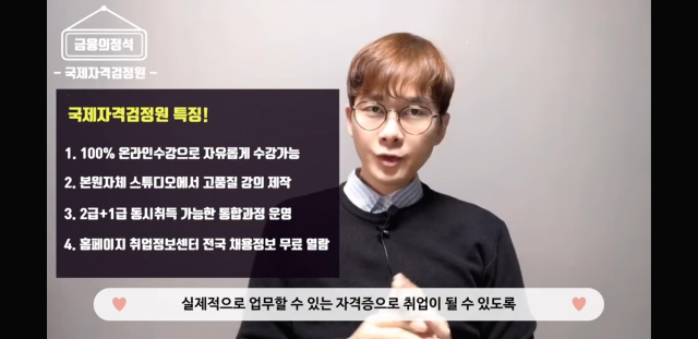 특히 100% 온라인 강의로 이루어지기 때문에 자유롭게 수강이 가능하다는점이 가장 큰 장점이며 합격하면 정식으로 자격증이 발급되는것.