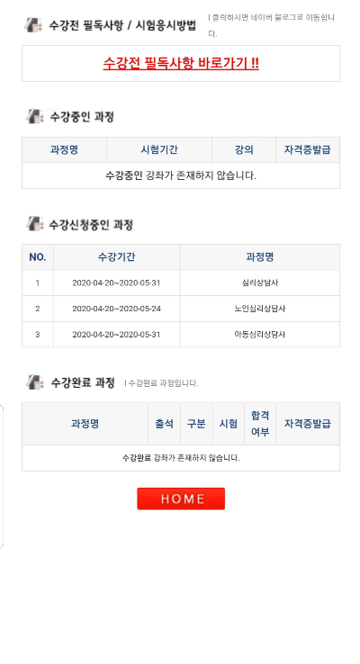 시간이 부족한 사람들도 모바일이나 PC로 수강이 가능하고 과정별로 60점 이상 온라인시험 합격시 자격증 신청 가능하기 때문에 주말이나 출퇴근 시간을 이용해서 쉽게 자격증을 취득할 수 있다.설령 시험에 떨어지거나 수강 중도에 포기하더라도 어차피 무료이기 때문에 내가 손해볼 것은 없다는 장점!! 그렇기 때문에 무조건 도전각!!!