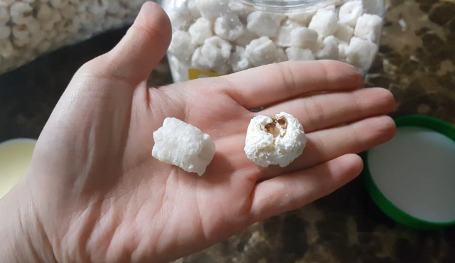 나란히 비교를 해 보면 거친 상남자 같은 강냉이 군과 뽀얗고 뽀송뽀송한 솜털 느낌의 포만 곤약팝콘의 모습 ㅋㅋ
