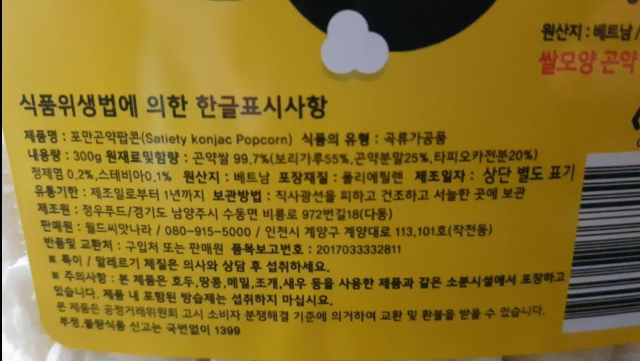 케이스에 적혀있는 한글 표시사항 참고하시고요 참고로 곤약쌀로 만들었다 합니다.ㅋㅋㅋ 쌀과 곤약의 탄수화물 차이는 엄청나다는거. 보관은 직사광선을 피한 서늘한곳. 내용량 300g 입니데이.이제 다이어트 분야에서 강냉이를 이긴 포만감 간식추천 포만 곤약팝콘의 무게를 한번 재 보는 시간을 가지겠음.