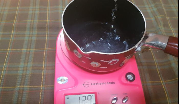 5분후에 티백을 꺼낸다음 바로 저울에 올려서 (저울위에 접시하나올림.뜨거우니까) 바로 계량한다 흑설탕 백설탕을 각각 45g씩 넣어주고 저어주지말고 그대로 중불로 설탕이 녹을때 까지만 끓여준다 대충 5분을 기준으로 확인한다.