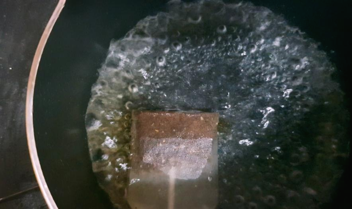 적은양으로 빨리 만들기위해 물을150g을 냄비에 끓인다.(이때 150g의 차가운 물 보다는 온수를 부어주면 더 빠르게 만들수 있음) 바글바글 끓으면 이때 티백1개 투입하고 중불로 5분동안 끓임. (많은양을 원한다묜 x2)