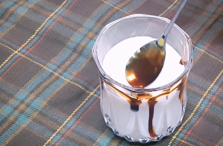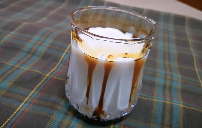 그리고 소스병에 담긴 시럽을 잔들 돌려가며 유리잔 벽을 기대서 넣어주는데나는 아직 소스병에 안담아서 스푼으로 어설프게 담아보았다.ㅋ얼음이 없으니 모양은 덜예쁘나맛은 뀯!! 희석되는게 싫고 단지 모양이 좀 안예쁠뿐..