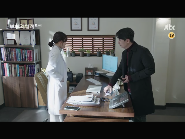 손꼽히는 병원밉상 설명숙은 이때도 병원장 옆에 알짱알짱 거리면서 부원장 하고싶다고 분위기 파악못하고 계속 아잉 거리자 병원장도 참다가 빡쳐서 미혼이라서 안됨. 김윤기는 남자선생이잖아 남자랑 여자가 같나. 하여튼 여자들이 문제야 하고 재수없는 발언을 하자