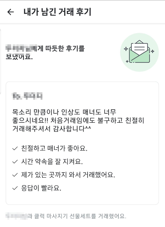 이렇게 서로 좋은 후기들이 쌓이면. 판매자의 매너온도 상승에도 큰 기여를 해서 구매자에게 신뢰감을 줄 수 있다.