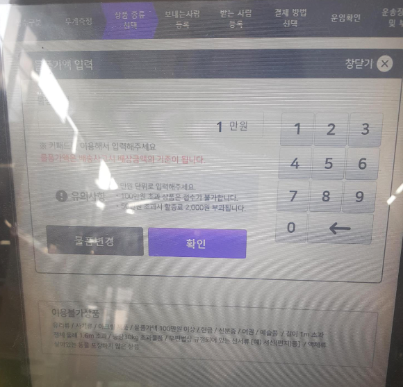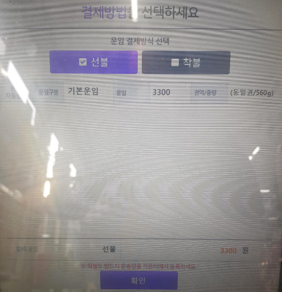 현장접수 후에는 준비해온 택배의 무게를 재기위해 저울위에 올려둔다. 앞전에는 티셔츠 하나를 보내봤는데 너무 가벼워서 무게 측정이 안되더라는.. ㅋㅋㅋㅋ 이번에는 드라이기를 보내는거라 무게가 나왔다!!ㅋㅋㅋㅋ 무게측정후에는 국내택배 터치.