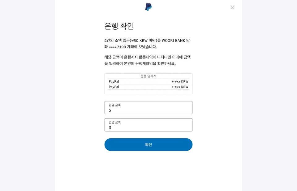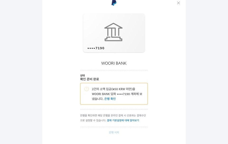 이런 화면이 보일것이다. 여기서 오우케이를 눌러주고 기다림의 시간을 가진다. 보통 2-4일 페이팔(PayPal)로 부터 등록 계좌에 소액의 돈이 2회 입금이 될것임. 난 이틀 지나도 안오길래 아.. 왜안오지 하면서 그랬는데 생각보다 시간이 걸리더라구... 그렇게 시간이 지나면 본인이 등록한 이메일로 은행계좌를 확인하라는 메일이 도착하고 초스피드로 계좌에 들어갔더니