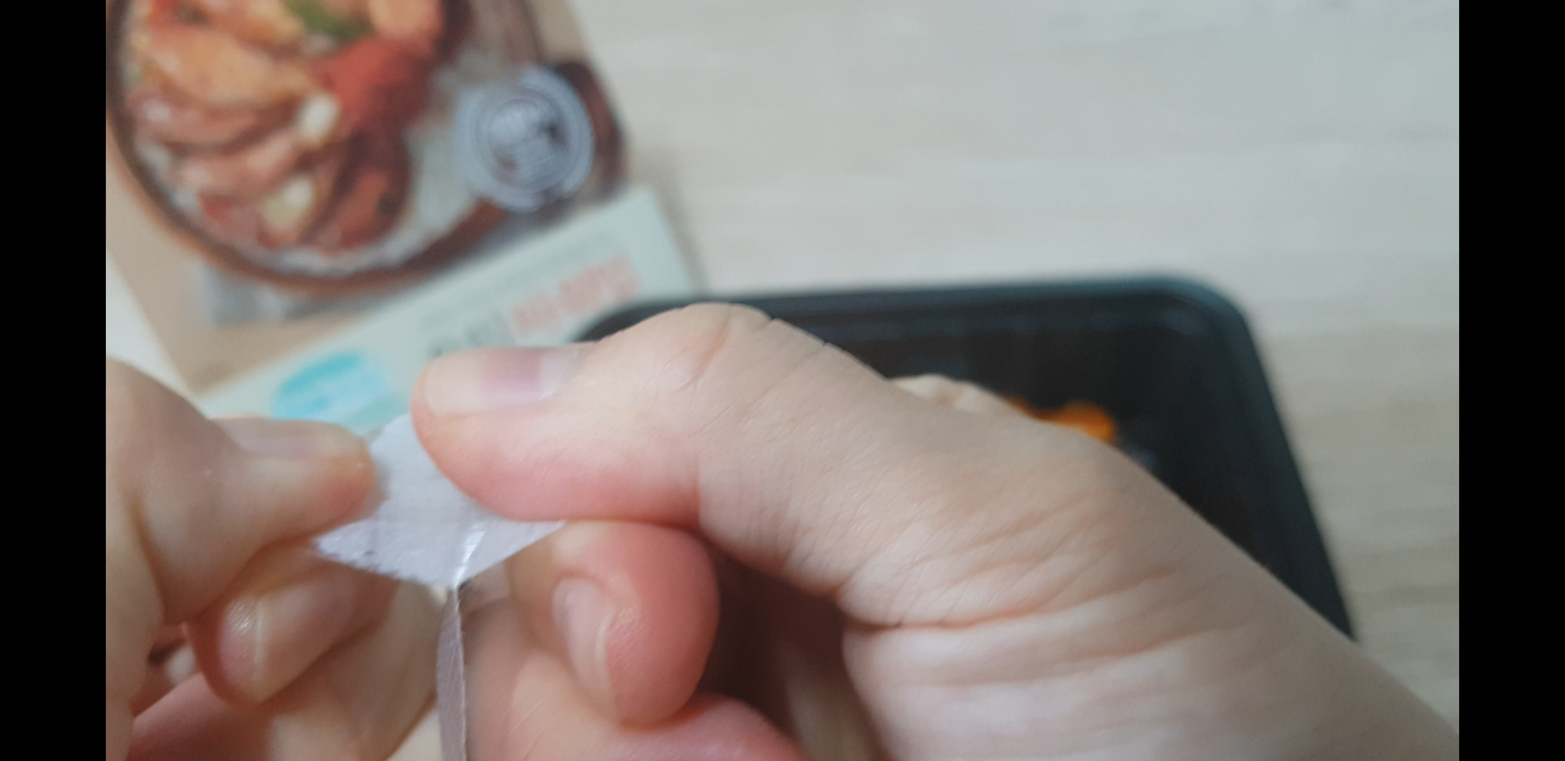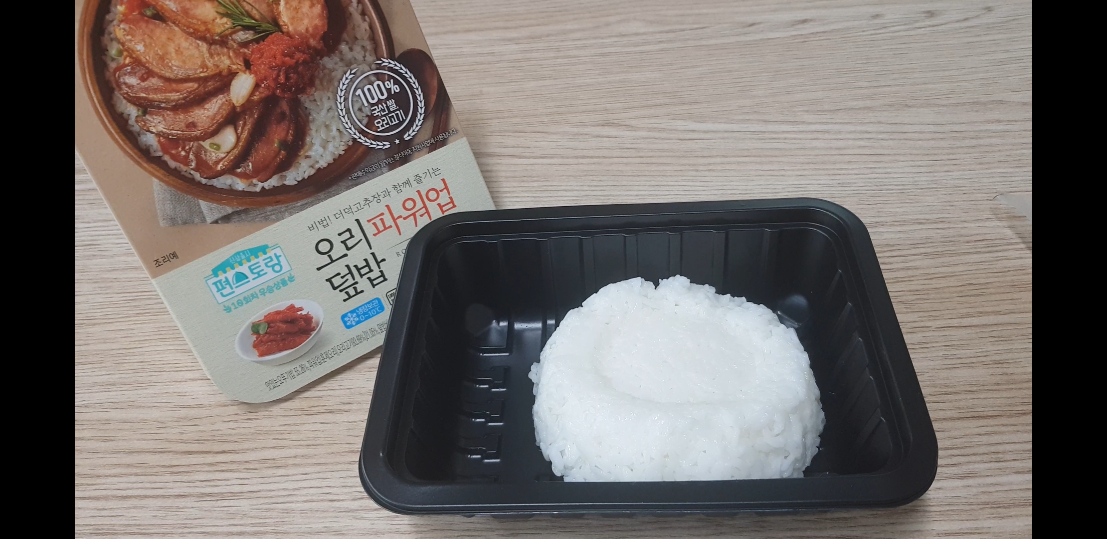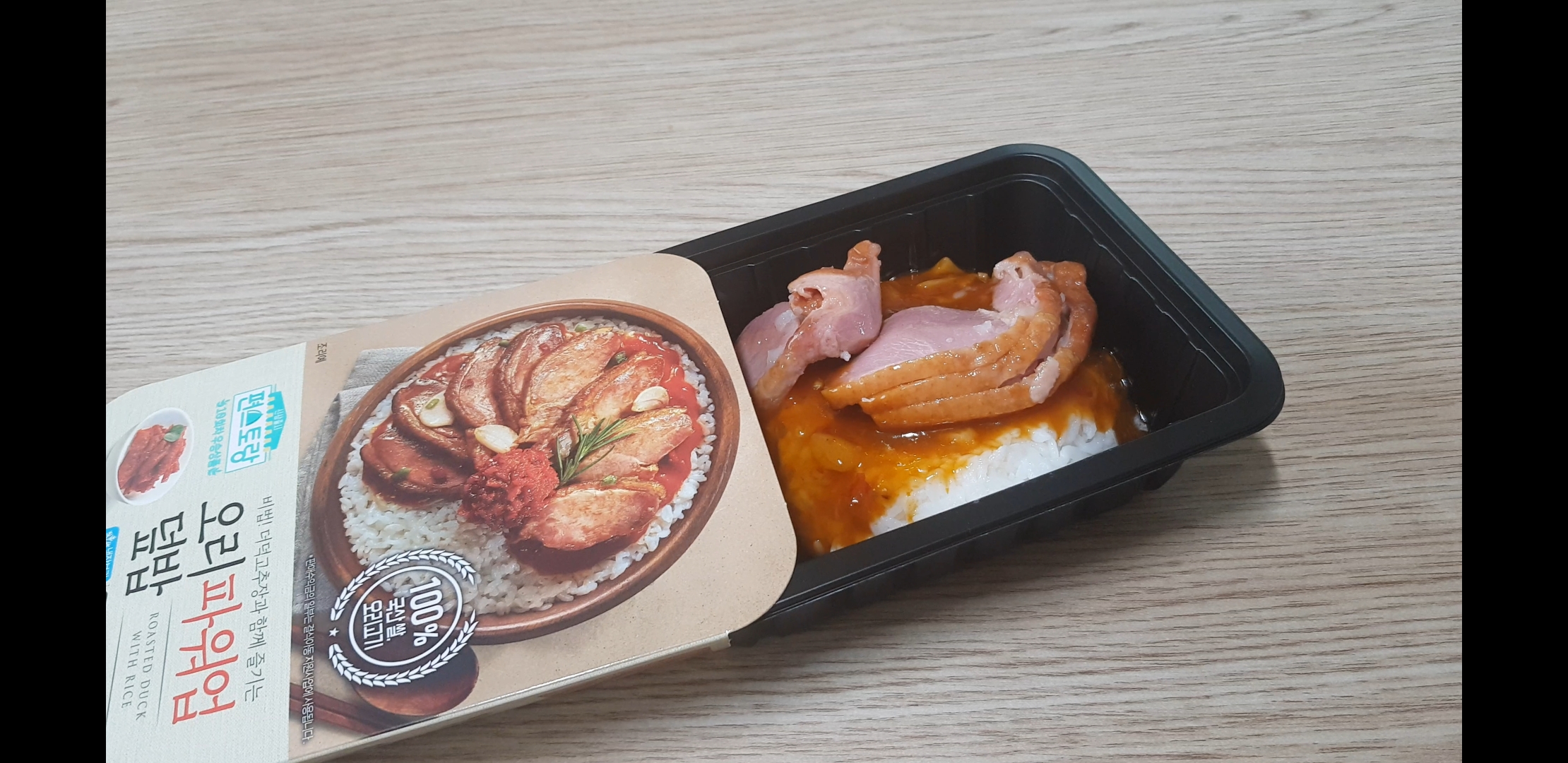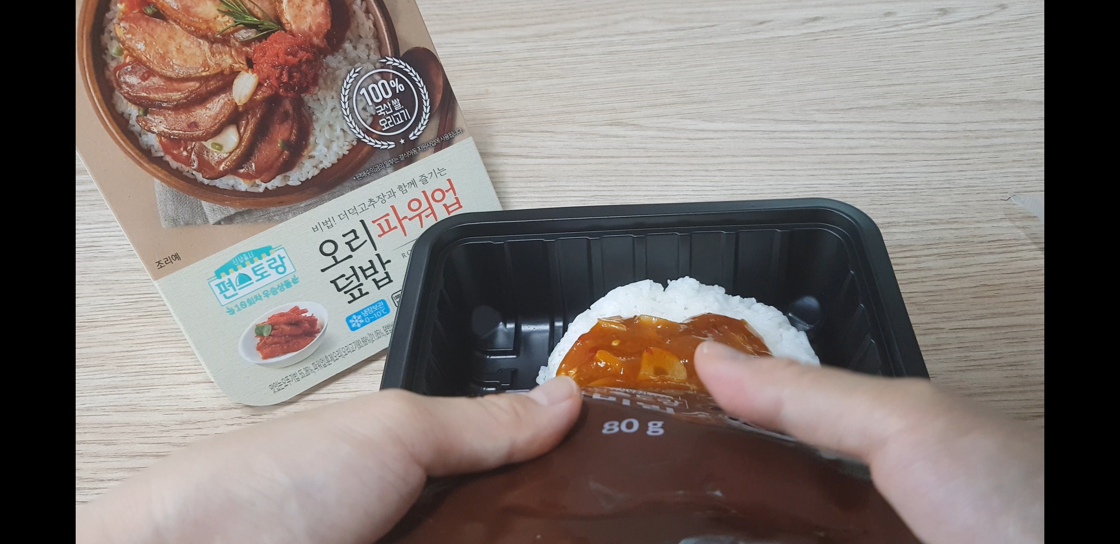 오늘의 주인공 면역력 업덕밥의 메인 훈제오리 !! 어떻게 뜯느냐. 한쪽에 살짝 스티커처럼 벌어진 쪽을 양손으로 잡아당기면 됨.