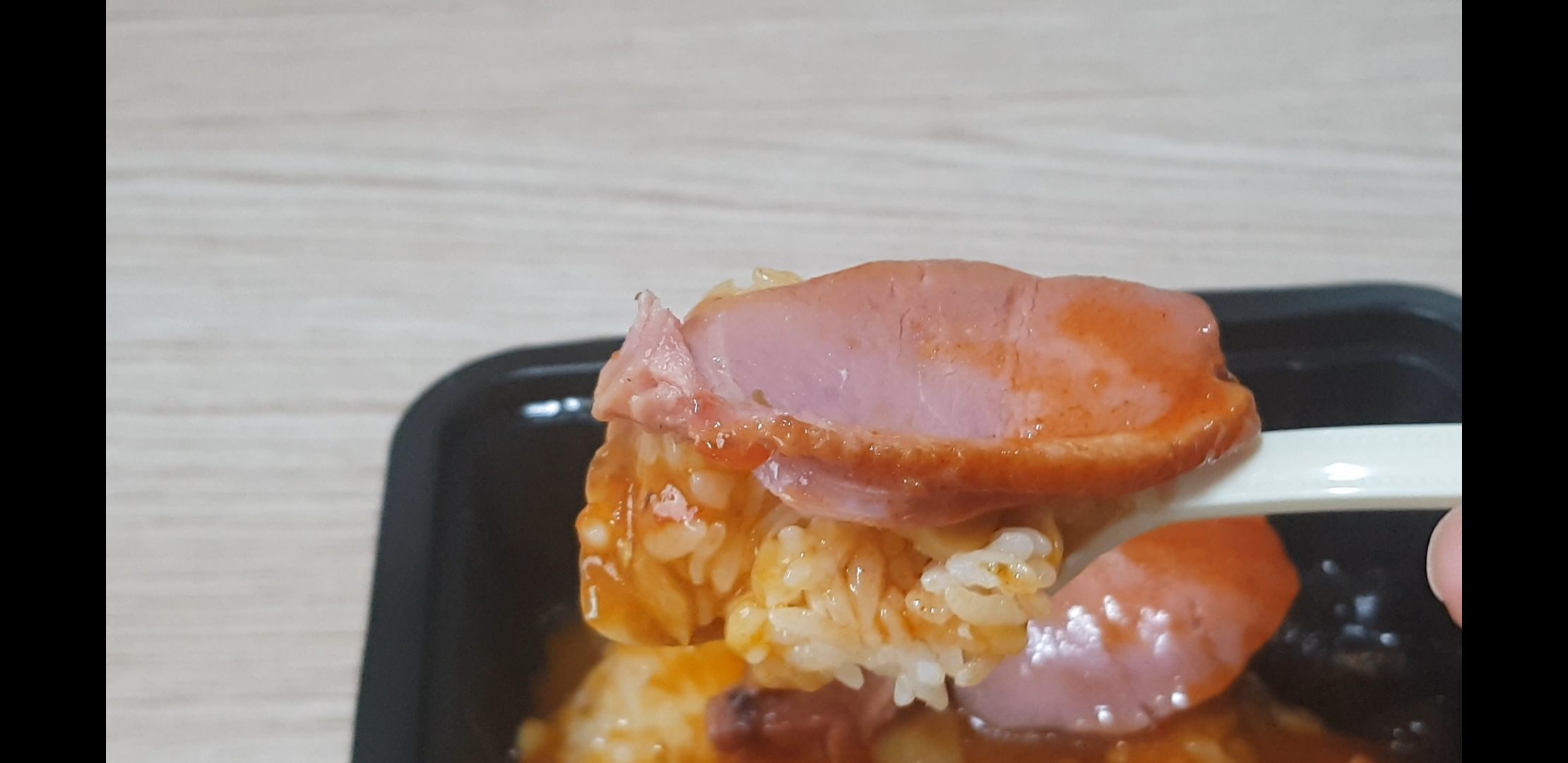 우선 안쪽을 들여다보면 오뚜기밥이 두둥! 하나하나 꺼내보면 덮밥 비빔소스, 훈제오리, 비법 더덕고추장소스,일회용 포크달린 스푼까지 들어있음.