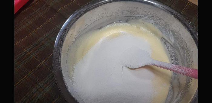 이제 벌써 마지막 작업. 박력분 50g,베이킹파우더2g을 채에 걸러서 넣어줌ㅋ베이킹파우더는 내맘대로 넣었다..ㅋ
