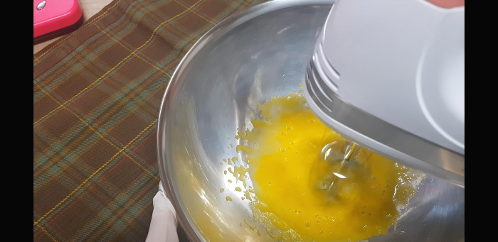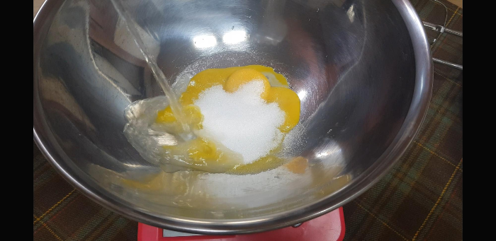 우선은 노른자 먼저 손봐준다.노른자에 설탕 25g, 물20g넣어줌 저울 위에놓고 바로 계량ㅋ