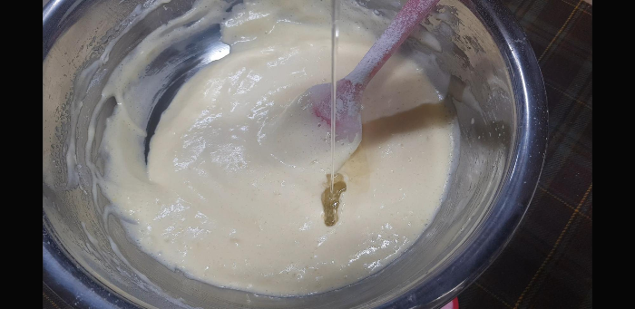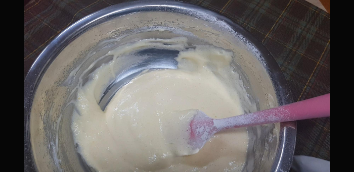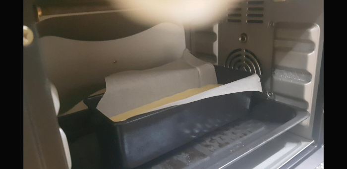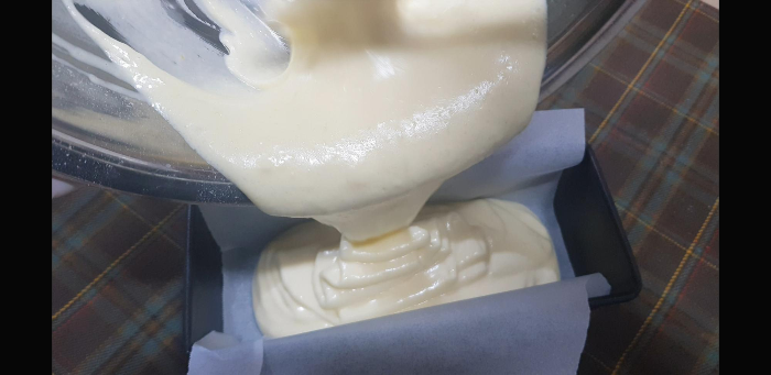 중간크기의 파운드 팬에 부어준다. 사실 원형팬인들 어떠하리ㅋㅋ(그럼 진짜 둥근 쉬폰케익 되는거 아님?ㅋ)