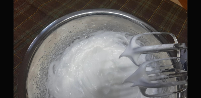 다음 흰자에 설탕45g 넣고 강하게 마구마구 윙윙윙 해줌.언제까지? 들어 올렸을때 뿔이 생길때 까지.(참고로 당연한 얘기겠지만 흰자로 머랭을 칠때 최고로 무모한것은 핸드믹서 없이 수동 거품기로 머랭을 치는것.. 꼭 핸드믹서가 필요하다.특히나 머랭을 칠때는..)