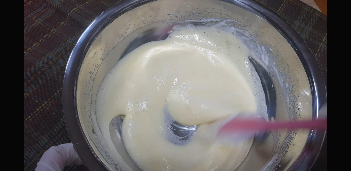 주걱으로 달래가며 골고루 섞어줌 가루가 보이지 않게.