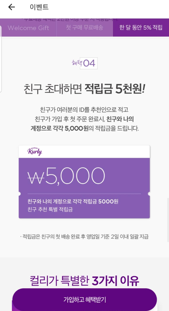 회원 가입 후 첫 구매시 하나만 사도 무료배송 ID당 1회적용 / 친구 초대하면 친구와 나는 각각 5000원 적립금 지급. 나이거.. 급하게 한다고 못해버렸지 뭐야... 하... 요즘 5천원 큰데..또르르..