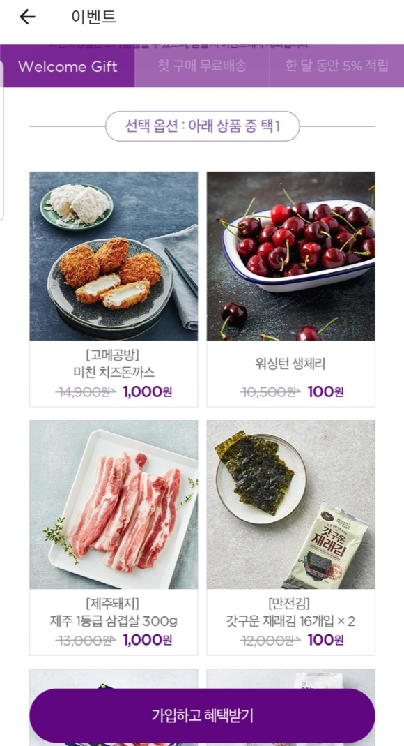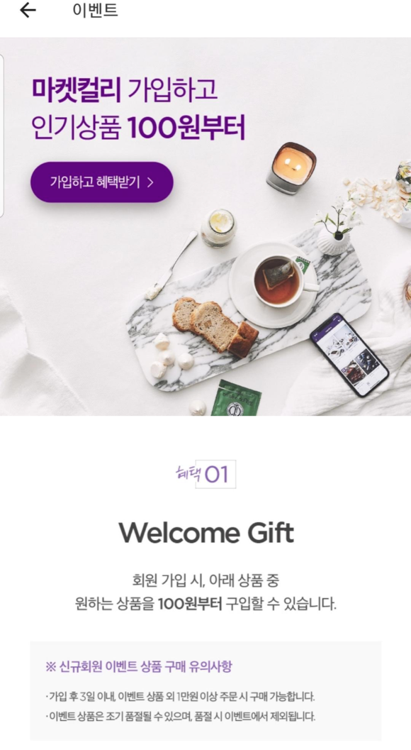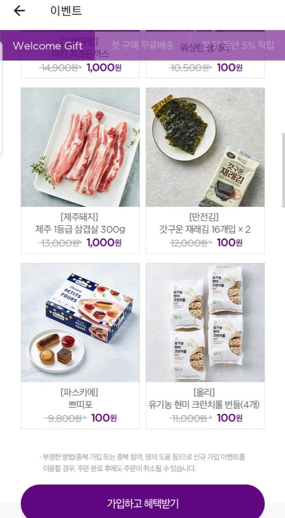 앱을 설치부터 하고 들어가면 첫 화면부터 웰컴투 신규가입 인기상품 100원부터가 가장 먼저 보인다. 기간이 임박해서 쫄리지만 다음달에 또하겠지...ㅋㅋㅋ 암튼 자세히 보러가기에 들어가면 구매 유의사항에 신규가입후 3일 이내에 이벤트상품 외 1만원이상 주문시 가능..ㅋㅋ