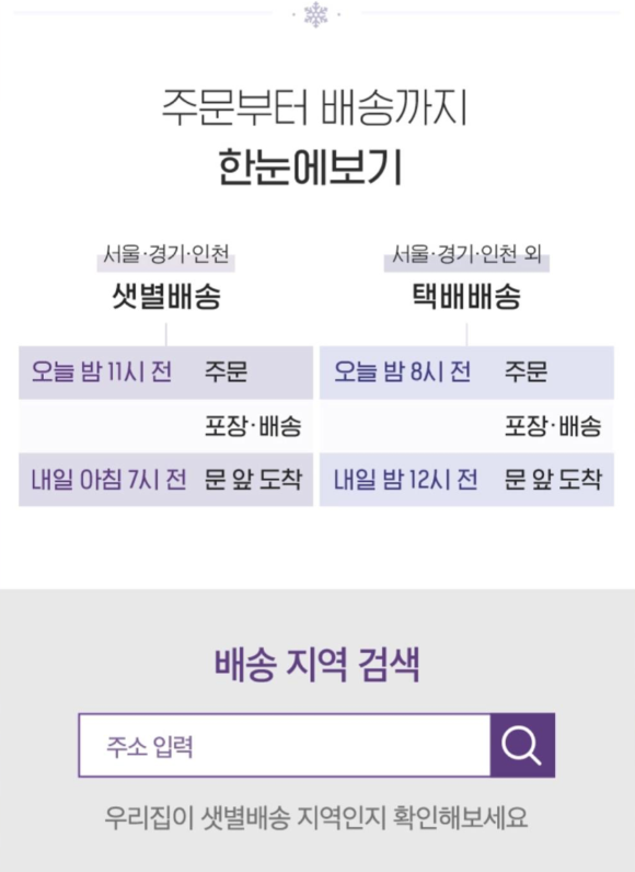 전지현이 나오는 마켓컬리 광고에서 강조하는 샛별배송은 수도권만 가능..ㅋㅋ 서울 경기 인천 가능. 뭐 새벽까지 안바란다 하루만에 와도 땡큐임.ㅋㅋㅋ 너무 쿠팡 새벽배송에 익숙해져서..ㅋㅋ 요즘은 이틀걸리면 뭔가 지침 ㅋㅋㅋㅋ