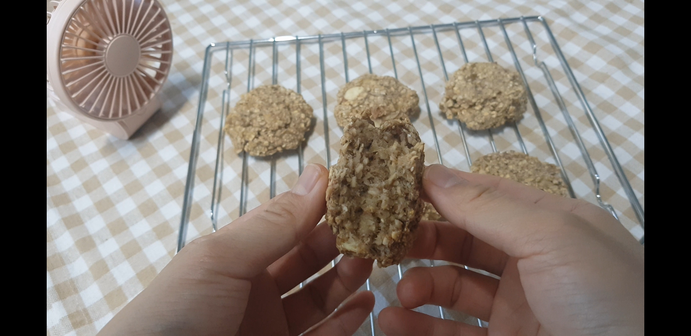 빨리 식히고 싶은 마음에 ㅋㅋ손풍기 가동하며 쿠키를 반으로 갈라보겠음.