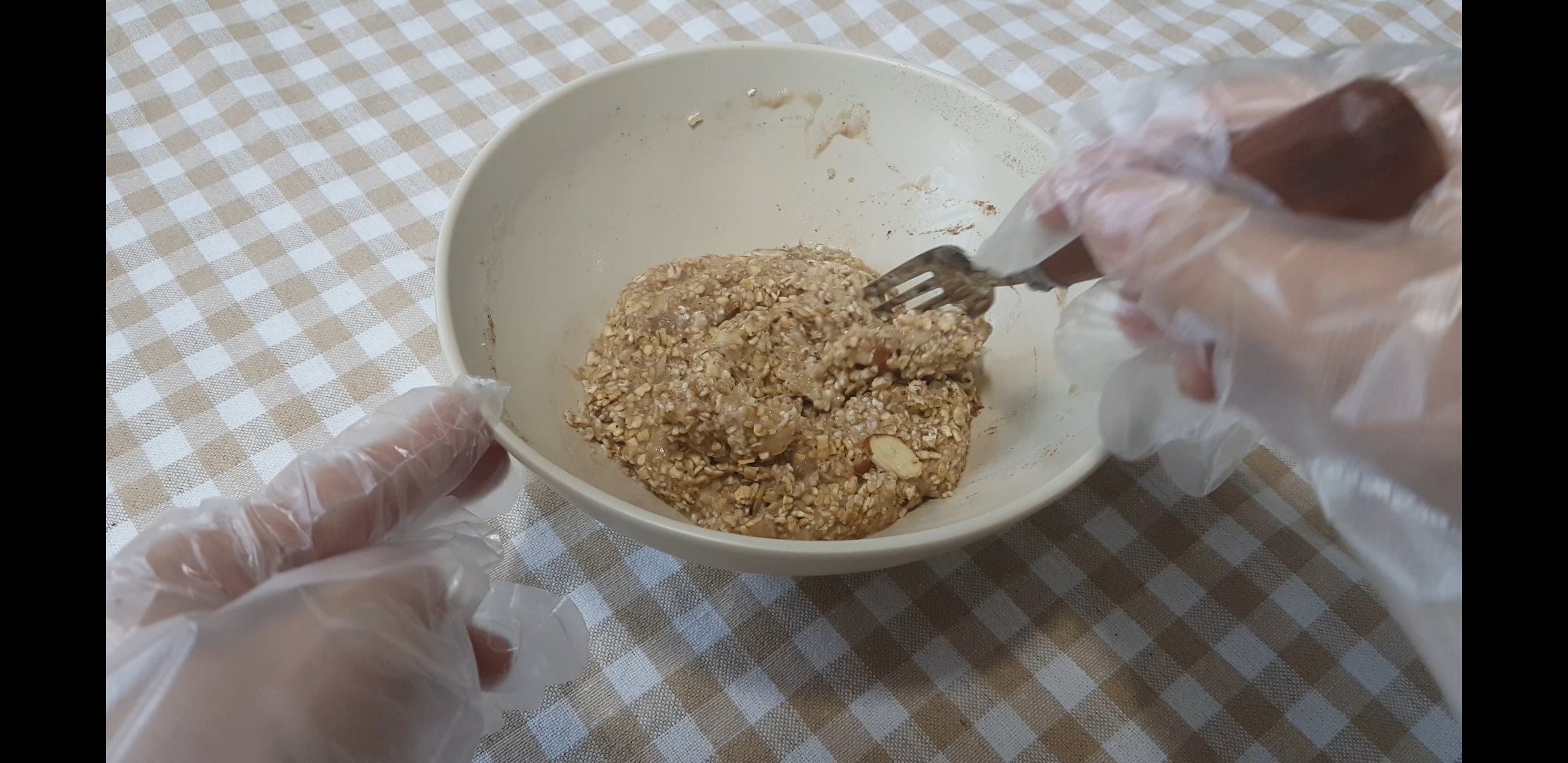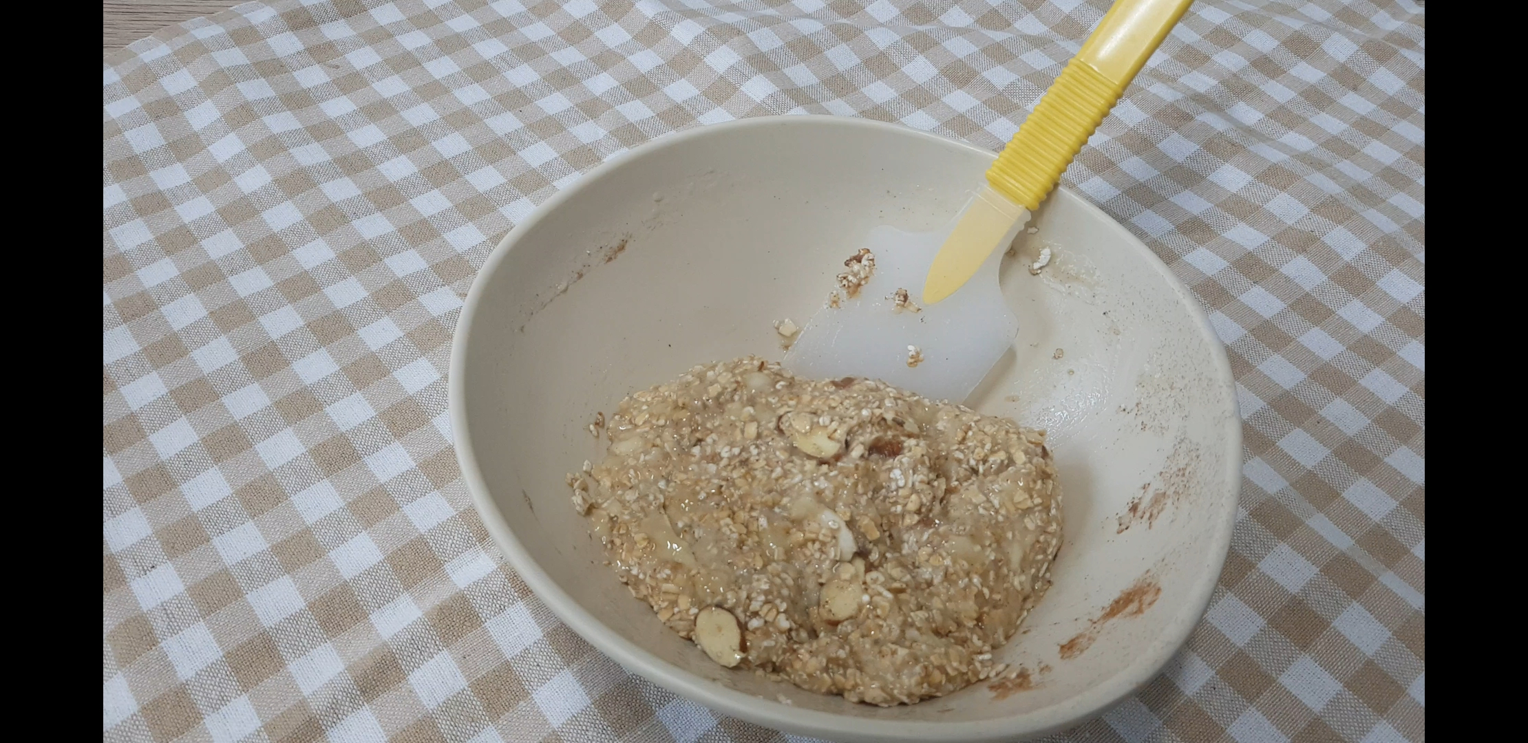이렇게 살짝 꾸덕한? 뭉쳐지는 느낌이 든다. 이렇게 반죽은 끝! 이까지 바나나만 잘 익으면 5분이 왠말이야 5분도 안걸림... 암튼 여기서 오트밀이 살짝 부풀때까지 20분을 실온에 두기.