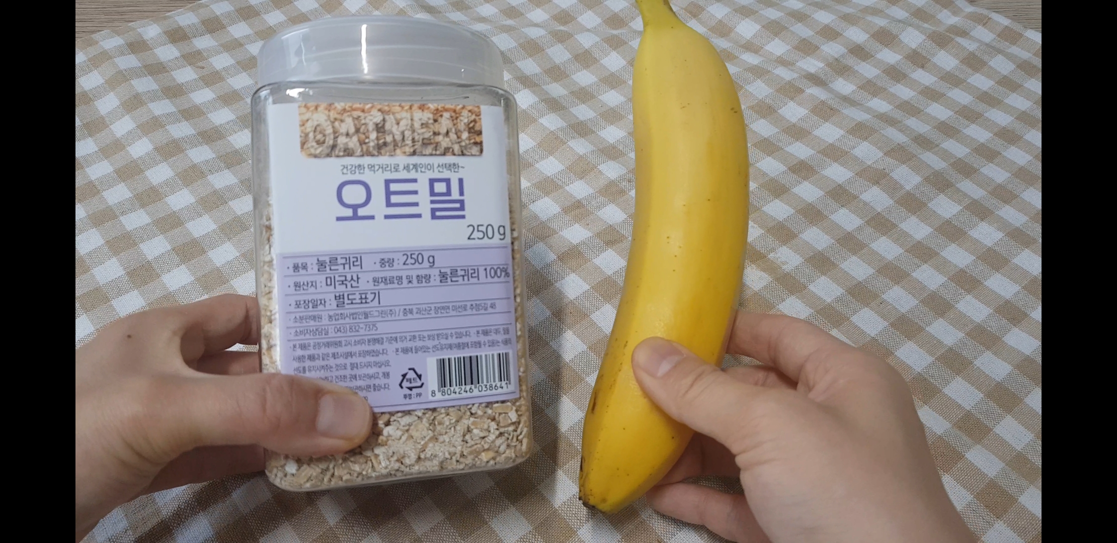 손이 무안할 정도의 재료소개 단 두가지 오트밀과 바나나 준비. 참고로 영상에서 나왔던 오트밀을 구할수 없어서 마켓컬리에서 주문한 오트밀과 바나나 준비.