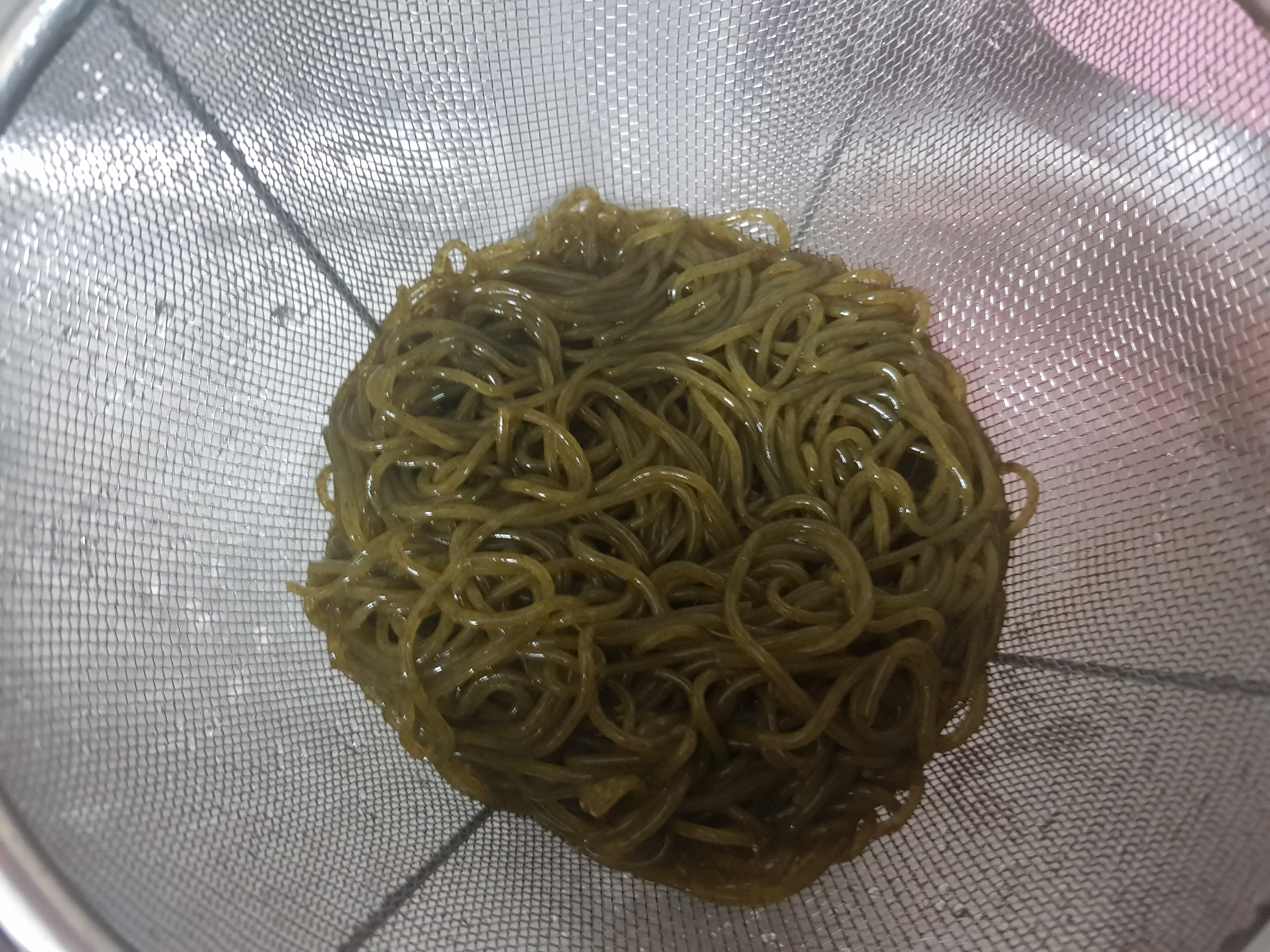 오호라? 생각보다 양이 적지않은데?ㅋㅋ 나름 묵직함.ㅋㅋ 적당히 샤워를 시켜줌. 면 하나를 들어서 만져보니 느낌이 신기하다..ㅋㅋ 다시마를 면으로 만들 생각을 하셨다니... 박수세번 짝짝짝