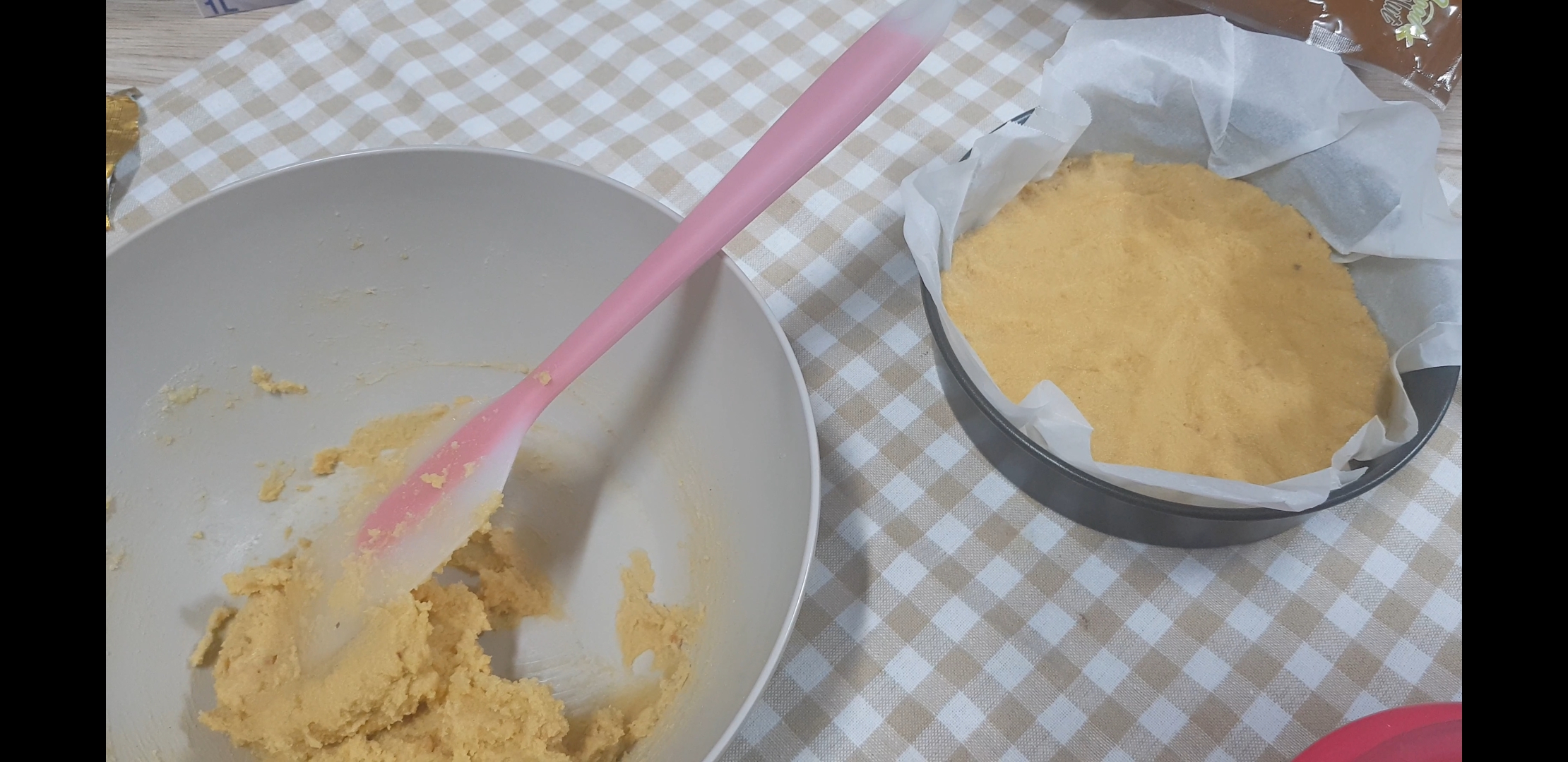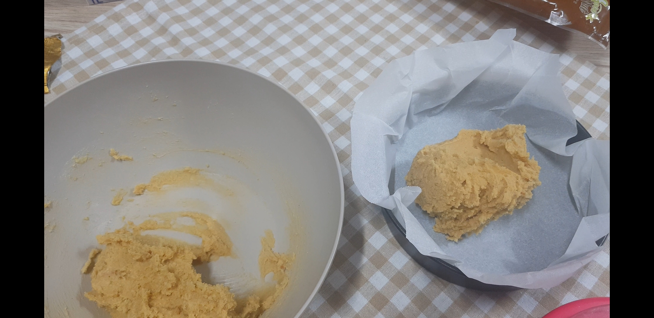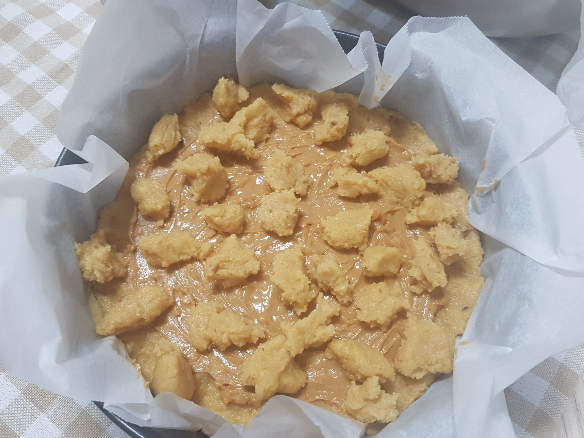 반죽의 2/3을 팬 밑바닥에다가 깔아줌. 나머지 부분을 마지막에 조금씩 떼어내서 크럼블로 올려줄거임. 참고로 20X20 정사각팬에 하면 좋은데 나는 둥근팬 밖에 없어서 둥근팬을 사용함.