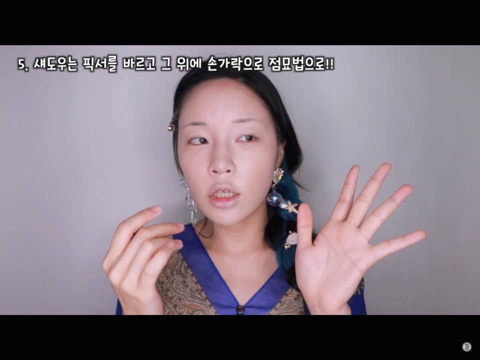 섀도우도 지속력을 위해 손가락에 픽서를 뿌린다음 눈두덩이에 바른다음